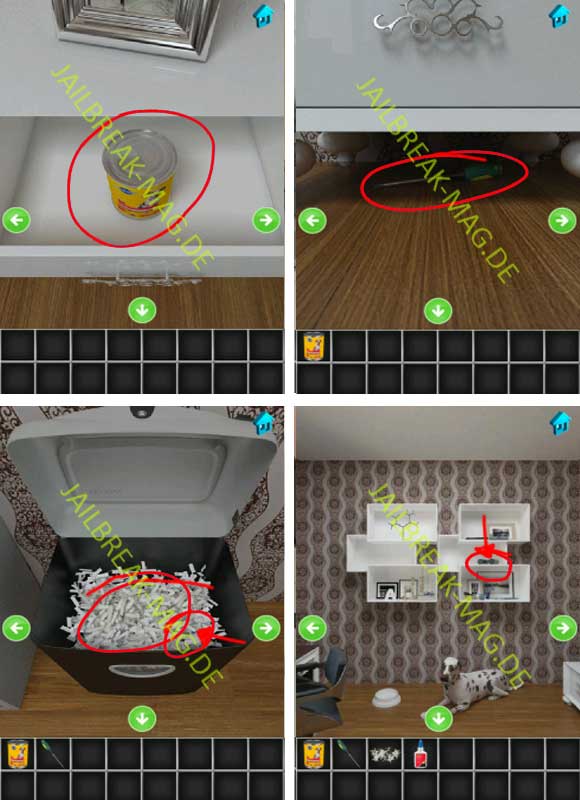 Bewege dich auf den weißen Schrank links neben der Tür zu und öffne die Schublade. In der Schublade befindet sich eine Dose Hundefutter. Bewege dich dann einmal zurück und schaue unter den SChrank. Darunter ist ein Schraubenzieher, den Du in aufnehmen kannst. Bewege dich dann zu dem Papierschredder und öffnet die Klappe. Entnehme ein wenig geschreddertes Papier und ein leicht blau leuchtendes Teil (siehe ersten Screenshots von Level 26). Bei dem Teil handelt es sich um den Deckel von einem Kleber. Drehe jetzt wieder einmal nach rechts zu einer Wand mit einem großen Regal. Im linken zweiten Fach befindet sich ein Fernglas.