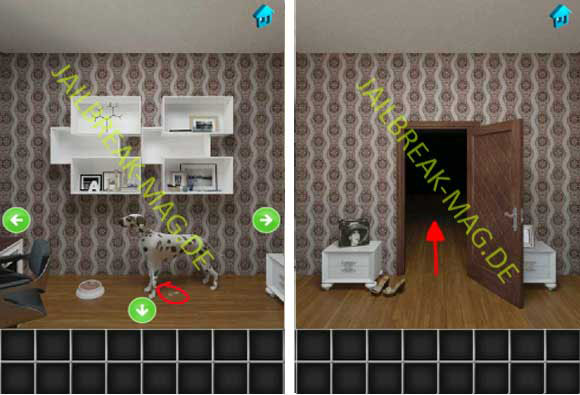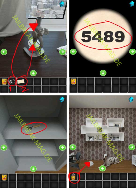 Bewege dich nun zum Fenster wo ein Tisch mit einem Mikroskop steht. Benutze den Schraubenzieher mit dem Fernglas, um eine Linse zu erhalten. Kombiniere jetzt das Papier mit dem Kleber und du erhälst ein ganze Stück Papier. Verbinde jetzt die Linse mit dem Mikroskop und lege das Stück Papier unter die Linse. Wenn Du jetzt durch das Mikroskop schaust sieht Du einen Code, und zwar den Code 5489. Mit diesem Code kannst Du den Safe im Raum öffnet und erhälst dadurch einen Dosenöffner. Öffne das Hundefutter und gebe es in den Futternapf von dem Hund (der Hund befindet sich in dem Abschnitt mit dem großen Regal an der Wand.