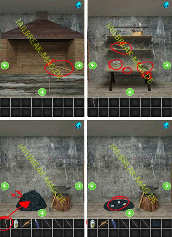 Drehe dich in 100 Escapers Level 27 als erstes zu dem Abschnitt mit dem großen Kamin. In dem leeren Kamin befindet sich eine Spitzhacke. Drehe dich dann weiter zum Abschnitt mit einem großen Werkzeugtisch. Dort musst Du eine Reihe von Gegenstände aufnehmen. Zu den Gegenständen gehören:
