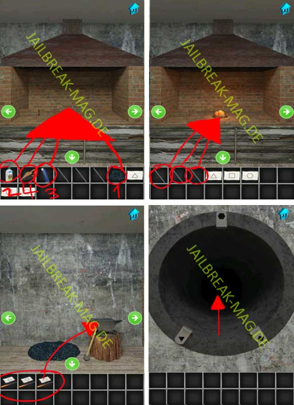 Gebe jetzt alle drei Rohre in das Feuer (nacheinander), um diese aufzuhitzen. Verbinde jetzt jedes Rohr mit einem anderen Blatt Papier und benutze diese drei jeweils auf dem Amboss neben dem Kohlehaufen. Im Anschluss erhälst Du drei verschiedene Bolzen die jeweils eine andere Form haben. Bewege dich jetzt zum Abschnitt mit dem Rohr und stecke die drei verschiedene Bolzen in die jeweiligen Löcher an dem Rohr. Wenn alle Bolzen in den jeweiligen Löchern versenkt sind, dann kannst Du den Deckel abnehmen und das Level mit einem Klick in das Rohr abschließen.
