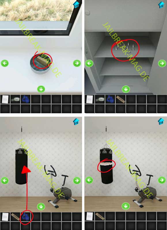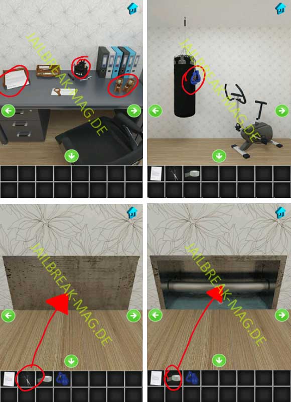In 100 Escapers Level 28 wird es schon etwas schwerer. Zu Anfang geht wieder das bekannte Gegenstände suchen und kombinieren los. Fangen wir direkt an, bewege dich vom Startpunkt zum Abschnitt mit einem Schreibtisch. Auf dem Schreibtisch findest Du neben einigen Zetteln, eine Schere und etwas Klebeband. Einen Abschnitt weiter hängt ein Box-Sack mit ein paar Handschuhe. Nehme die Box-Handschuhe in dein Inventar auf. Gehe als nächstes in den Abschnitt mit dem Fenster und zoome unten auf den dunkelgrauen Bereich. Benutze hier die Schere, um das Loch zu öffnen. Dahinter befindet sich ein Rohr, aus dem Wasser austritt. Benutze jetzt das Klebeband, um das Loch und somit das Leck zu stopfen.