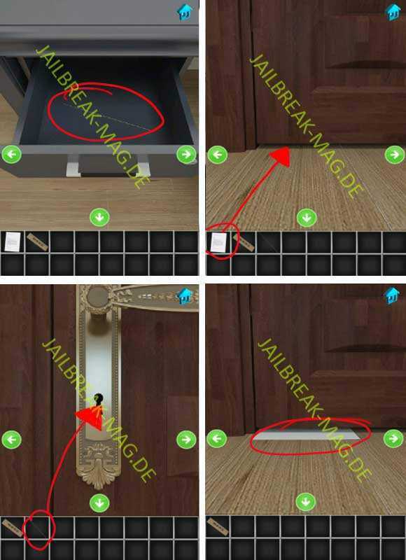 Mit dem Schlüssel kannst Du zwar nicht die Tür von 100 Escapers Level 28 öffnen, allerdings die verschlossene Schublade von dem Schreibtisch. In der Schublade befindet sich ein Stück Metal-Draht. Gehe jetzt zur Tür und schiebe das Papierstück unter dem Türschlitz hindurch. Stecke jetzt den Metal-Draht durch das Schlüsselloch. Nehme jetzt wieder das Papier unter dem Türschlitz auf und Du erhälst einen Schlüsse. Das ist der Schlüssel für die Lösung.