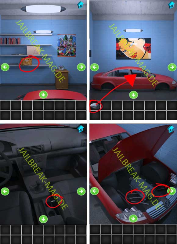 Level 29 von 100 Escapers gehört zu einem der kürzeren und einfachen Level. Als erstes musst Du dich vom Startpunkt einmal nach rechts drehen und auf die orange Box im untersten Regal klicken. Daraufhin erhälst Du einen Stein. Drehe dich jetzt einen Abschnitt weiter nach rechts zum Auto und benutze den Stein, um das Fenster aufzubrechen. Klicke jetzt in das Auto und ziehe an dem Hebel rechts neben der Handbremse, um die Motorhaube zu öffnen. In der Motorhaube befinden sich eine Batterie sowie mehrere Metal-Rohre.