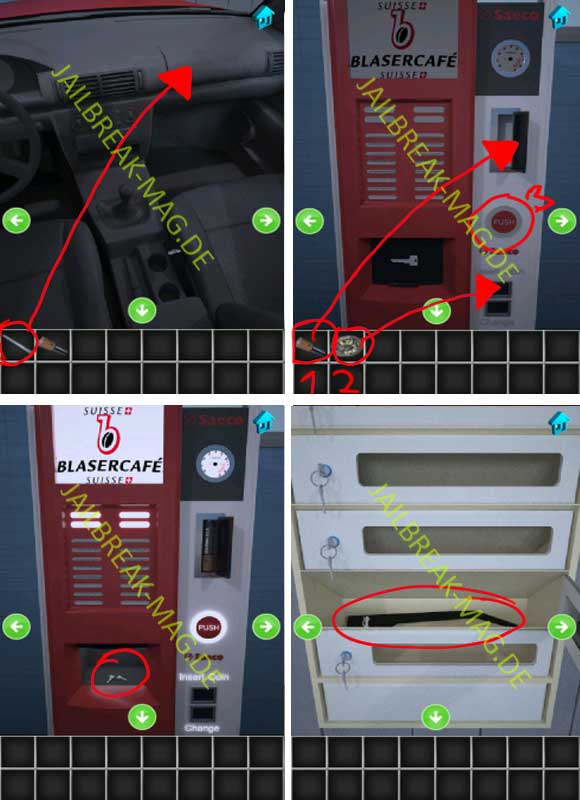 Bewege dich jetzt zurück in das Auto und benutze das Metal-Rohr, um das Fach vor dem Beifahrer-Sitz zu öffnen. Darin befindet sich eine Münze, die Du für den Kaffeeautomaten benötigen wirst. Bewege dich jetzt also zu dem Kaffeeautomaten und setze als erstes die Batterie in das oberste Fach ein. Werfe anschließend die Münze in das Fach und drücke auf den großen roten Knopf mit der Aufschrift „PUSH“. Wenn Du alles richtig gemacht hast, sollten jetzt im Fach des Automaten zwei Schlüssel liegen. Nehme die Schlüssel und gehen damit zu den Briefkästen an der Tür und öffne das zweite Fach von unten. In dem Fach befindet sich ein Hebel für den Kofferraum.