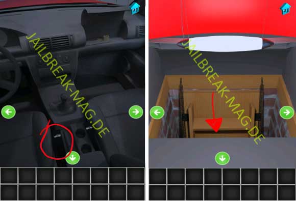 Setze den Hebel in das Auto ein (rechts neben dem Fahrersitz) und benutze diesen einmal. Gehe dann aus dem Auto raus und schaue in den Kofferraum. Dort geht eine Treppe in den Keller die gleichzeitig die Lösung für dieses Level ist.