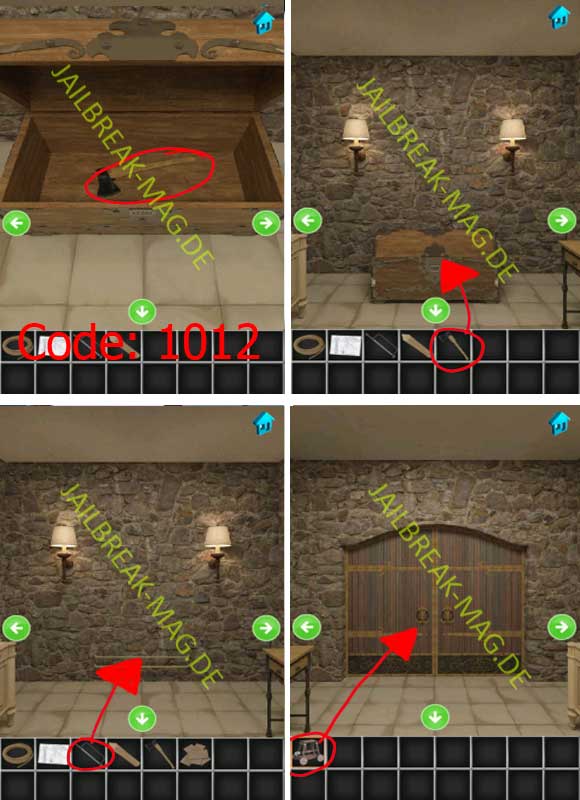 Benutze als nächstes das Holzstück mit dem überdimensionierten Bleistift-Anspitzer und drehe dich einen Abschnitt weiter nach rechts. Bewege dich jetzt auf die Holzkiste zu und gebe den Code 1012 ein (Uhrzeit von der Uhr einen Abschnitt vorher). Mit der Eingabe des Codes öffnet sich die Tür und Du kannst Du Axt entnehmen. Benutze jetzt die Axt mit der Truhe und Du erhälst eine Reihe von Holz-Brettern. Nehme jetzt die Säge und entferne die Metallstangen von der Wand, wo vorher die Truhe stand.