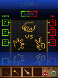 Im nächsten Level sieht man links und rechts einen Punktestand, einmal von dem eigenen Spieler und dem NPC (Computergegner). Die Symbole auf der Tür lassen es schon erahnen worum es in diesem Level geht. Das bekannte Spiel Schnick, schnack und schnuck wird gespielt. Um das Level zu lösen müssen folgende Zahlen von oben nach unten eingestellt werden. Die Zahlen können durch mehrmaliges Tippen verändert werden.