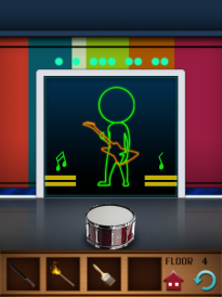In Level 4 geht es weiter mit lustigen Projektionen auf der Fahrstuhl-Tür. Vor der Tür liegt eine Trommel, die für die LÖsung des Levels im richtigen Takt geschlagen werden muss. Der Takt ist überhalb der Tür in Form von Lichtern zu sehen. Das Level bedarf eventuell etwas Übung, man bekommt es aber nach einigen Versuchen relativ einfach hin.