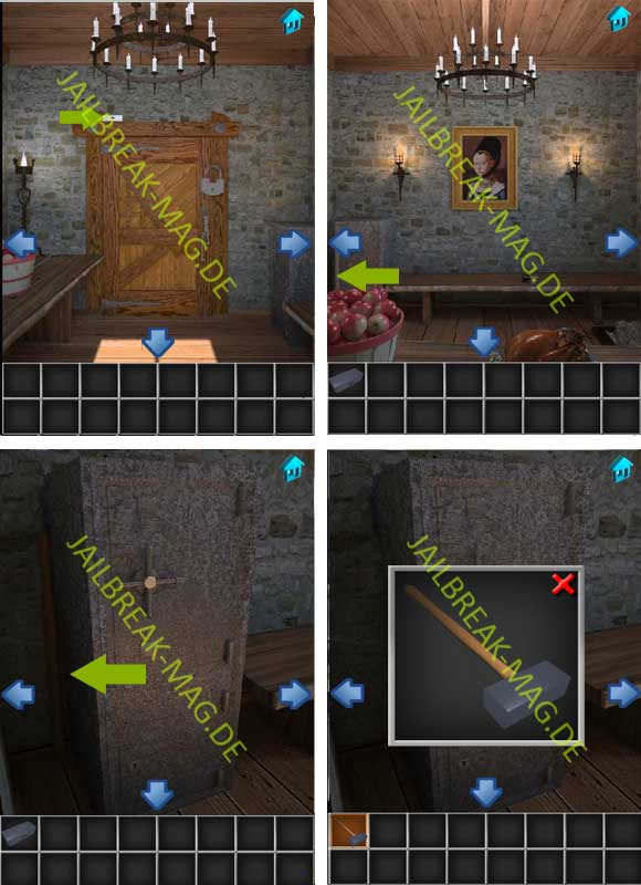 Nehme als erstes das Stahlstück eines Hammers oberhalb der Tür auf. Das Stahlstück des Hammers liegt direkt auf dem Scharnier. Drehe dich dann einmal nach links und zoome auf den Safe an der linken Seite im Raum. Neben dem Safe findest du ein Stück Holz. Verbinde jetzt das Stahlstück mit dem Holzstück und Du erhälst einen voll funktionsfähigen Hammer.