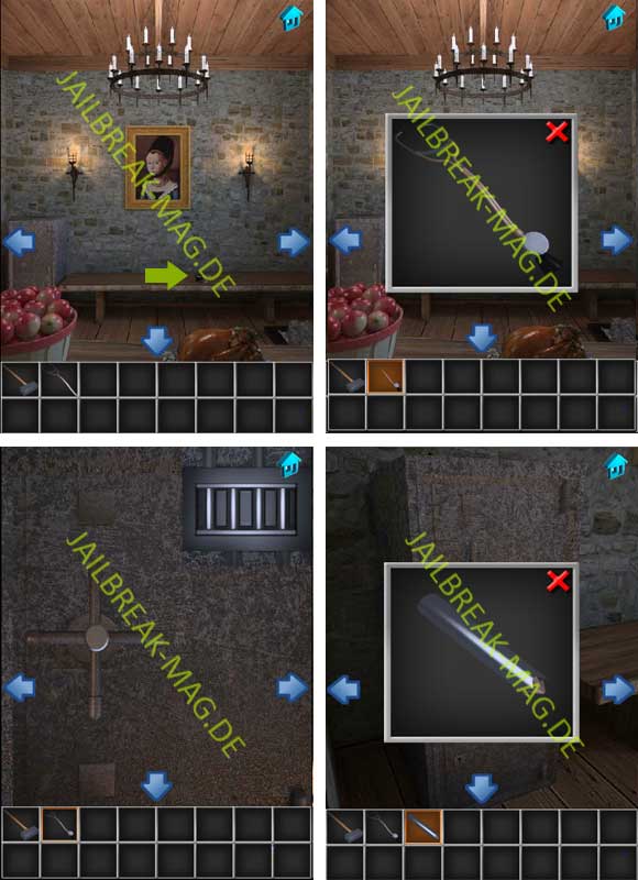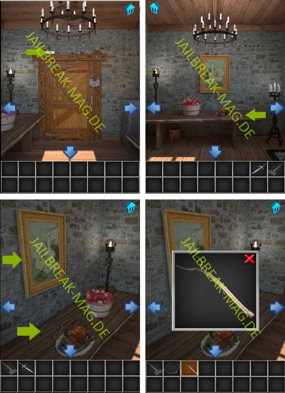 Drehe dich im nächsten Schritt zwei Mal nach rechts zum Tisch mit einem frisch gebratenen Hähnchen auf dem Tisch. Nehme das Messer von dem Tisch und bewege dich auf das Bild an der Wand zu. Nehme zuerst das Stück Stahl hinter dem Hähnchen auf und benutze anschließen das Messer mit dem Bild. Daraufhin erhälst Du eine Art Holzgabel. Verbinde das Stück aus Stahl mit der Holzkabel.