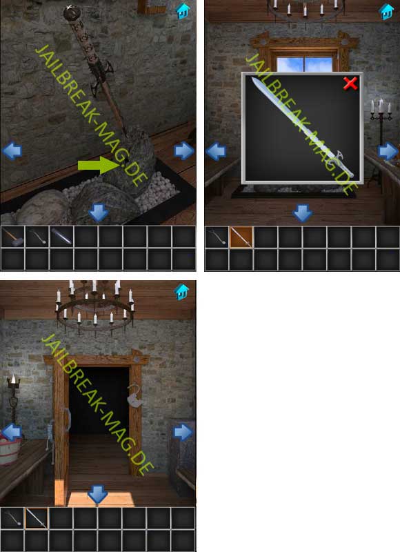 Bewege dich jetzt einmal nach rechts zum Fenster und zoome auf das Schwer. Stecke jetzt die Stahlspitze in das Loch von dem Stein, in dem auch das Schwert steckt und schlage mit dem Hammer auf die Spitze. Daraufhin zersplittert der Stein und Du kannst das Schwert aufnehmen. Mit dem Schwert kannst Du das Schloss an der Tür aufschlagen und somit Level 39 lösen.