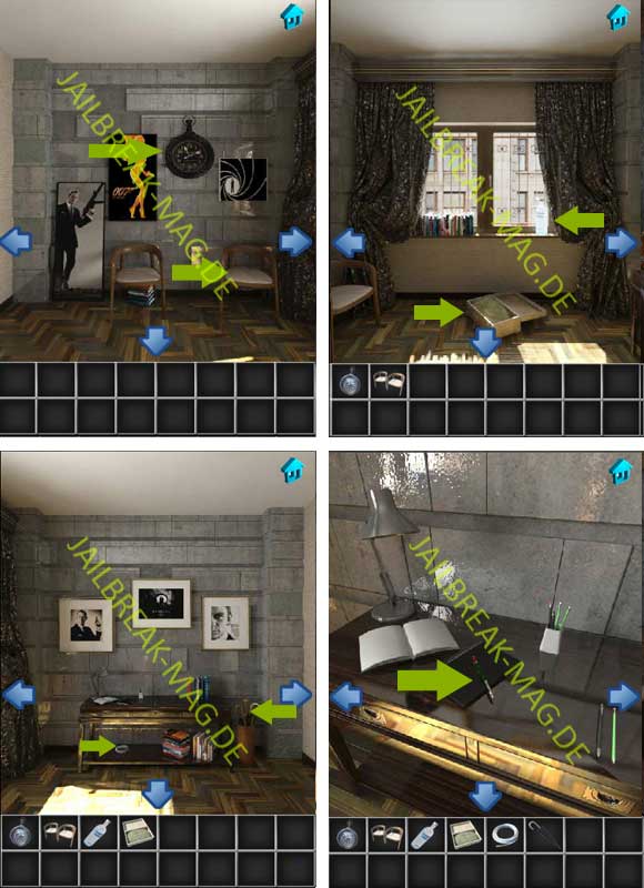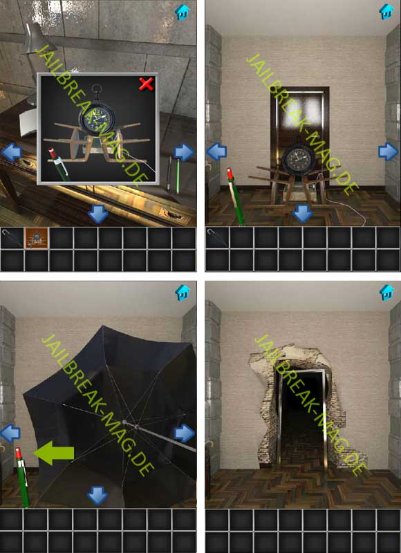 Machen wir weiter mit dem Walkthrough für Level 40 von 100 Rooms. In Level 40 musst Du wieder zu Beginn einige Gegenstände suchen und diese kombinieren. Drehe dich von Beginn an einmal nach rechts und nehme die Uhr sowie die Stühle auf. Drehe dich jetzt wieder einmal nach rechts und nehme die Flasch sowie die Kiste auf dem Boden auf. Anschließend geht es wieder einmal weiter nach rechts und hier finden sich auch wieder ein paar Gegenstände im Regal. Nehme das Kabel, den Regenschirm und den Kugelschreiber in dein Inventar auf.