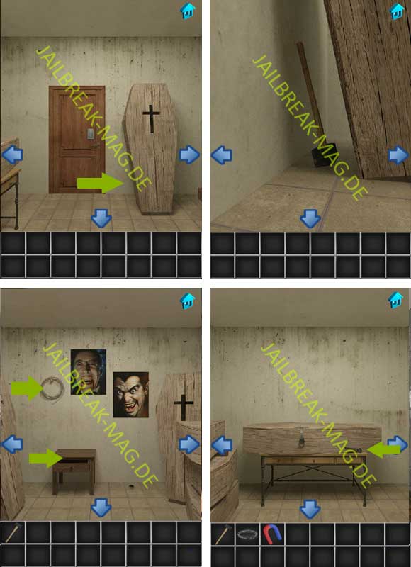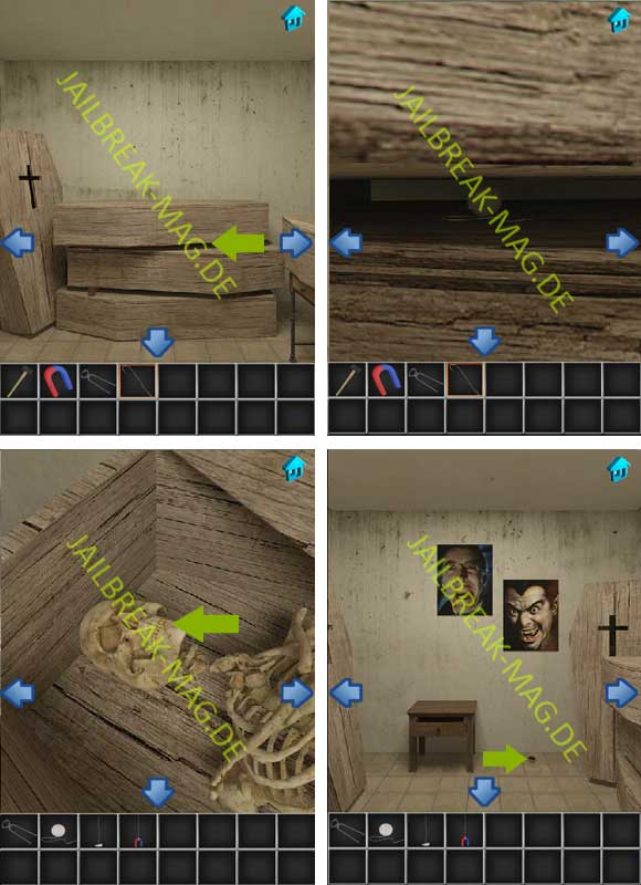 Drehe dich einmal nach links und zoome auf die kleine Lücke zwischen dem obersten und mittleren Sarg. Darin befindet sich ein Stück Wolle, die Du mit dem Haken raus ziehen kannst. Drehe dich jetzt wieder nach rechts und benutze den Hammer und dem Sarg zu öffnen. In dem Sarg befindet sich ein Skelett bei dem du mit der Zange auf den Schädel tippen musst. Mit der Zange erhälst Du einen Zahn von dem Skelett. Verbinde jetzt den Zahl mit dem Faden und den Magneten mit einem neuen Faden. Drehe dich mit den neuen Gegenständen im Inventar zwei Mal nach links und klicke unten auf dem Boden auf den kleinen schwarzen Punkt auf dem Boden.