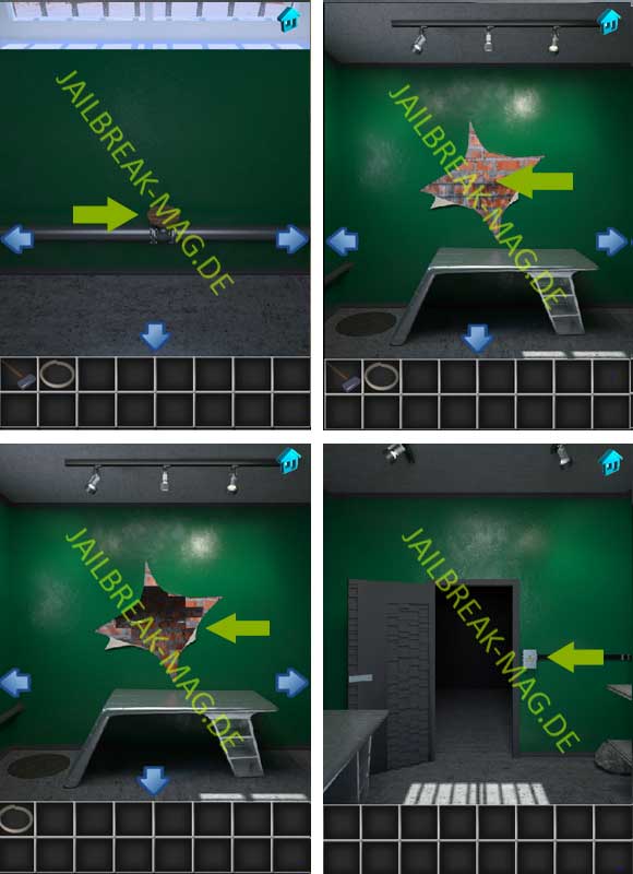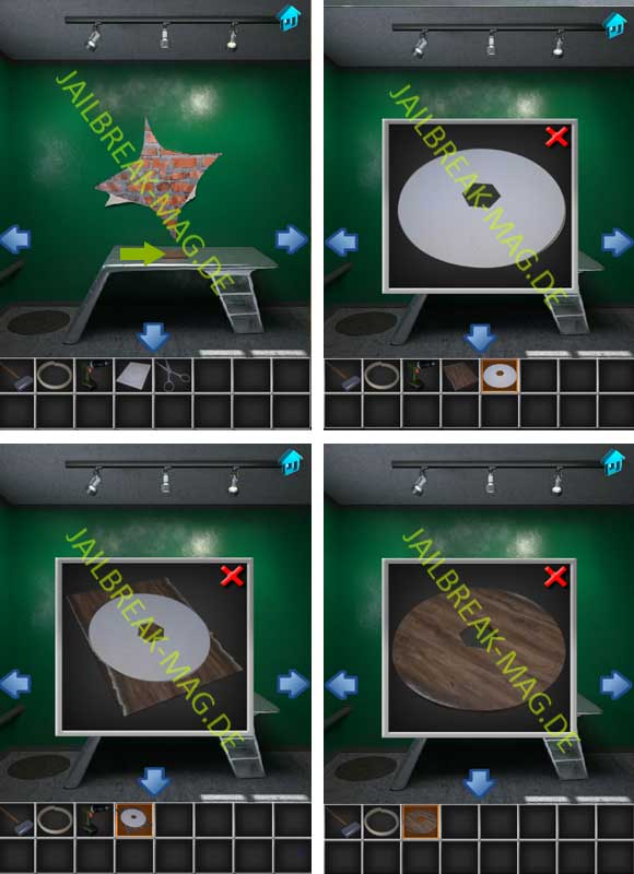 Bewege dich mit dem neuen Gegenstand wieder zum Fenster und zoome auf das Rohr. Lege die Holzscheibe auf den Rohranschluss und drehe dich nach wieder einmal nach rechts. Nehme den Hammer und schlage damit auf die sichtbaren roten Steine. Verbinde die beiden Stücke mit dem Rohr und klicke auf der Tür an der rechten Siete auf den Schalter. Jetzt öffnet sich die Tür und es kann weitergehen mit Level 43.