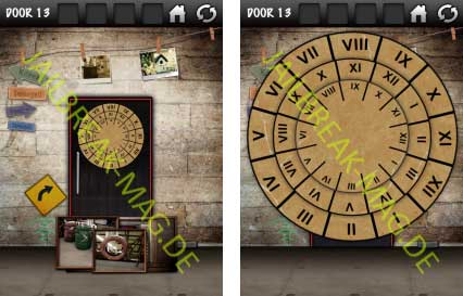 Klicke daraufhin auf das große Rad mit römischen Zahlen auf der Tür und drehe jedes Rat so, dass die eben gefundenen Zahlen darstellen.
