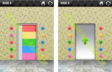 In Level 8 sieht man links und rechts neben der Tür insgesamt 5 Knöpfe auf einer Seite. Auf der Tür befinden sich Abschnitte in unterschiedlichen Farben. Die Lösung für Level 8 ist relativ einfach. Durch einen Klick auf die Knöpfe links und rechts neben der Tür kann die Farbe geändert werden. Ändere die Farbe so, dass Sie mit der Tür auf der Höhe übereinstimmt. Die Lösung kannst Du aus dem zweiten Bild des nachfolgenden Screenshots entnehmen.