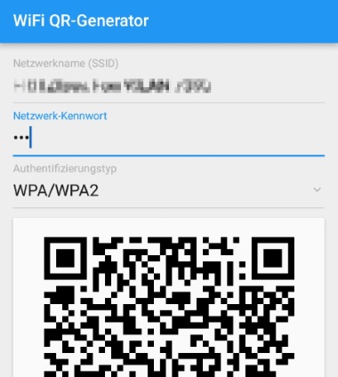 Wenn dein Android-Smartphone in den WLAN-Einstellungen keinen QR-Code mit dem WLAN-Passwort anzeigt, dann kannst Du diesen QR-Code auch selber erstellen. Dabei musst Du natürlich das Passwort einmalig selber eingeben, da die Apps wie oben schon erwähnt das Kennwort für die gespeicherten WLAN-Verbindungen nicht so ohne weiteres auslesen können, wenn man keine Root-Rechte auf dem Gerät besitzt. Hier bieten sich unter anderem Android-Apps wie der „WiFi QR Code Generator“ aus dem Google Play Store an.