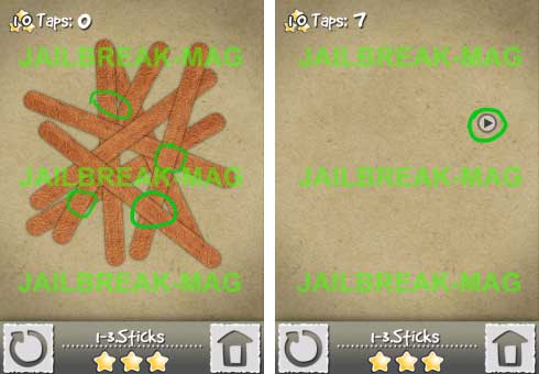 In Level 3 von Tap Play befinden sich viele Holz-Stäbchen auf dem Boden, die übereinander liegen und den Play-Button für die Lösung des Levels verbergen. Schiebe einfach alle Stäbchen mit dem Finger zur Seite und relativ weit oben in der Mitte erscheint ein kleiner Button. Du kannst Die Stäbchen übrigens nicht wahllos wegschieben, sondern musst beim obersten Stäbchen anfangen.
