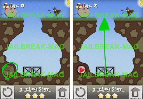 In Level 12 stehen sich zwei süße Monster gegenüber, können sich allerdings nicht in die Arme nehmen, weil Ihnen eine tiefe Schlucht den Weg versperrt. Um die beiden Monster zusammen zu bringen musst Du zuerst den leicht angeknacksten Stein unten links zwei Mal antippen. Anschließend kannst Du die Metall-Brücke von unten nach oben hochziehen.