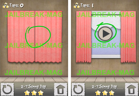 Draußen ist ein sonniger Tag, aber sowohl der Vorhang als auch das Fenster versperrt den Weg in Level 7 aus Welt 2 nach draußen. Tippe als erstes auf den Vorgang und schiebe dann die beiden Bretter vor dem Fenster zur Seite. Anschließend kannst Du das Fenster öffnen, in dem Du mit dem Finger von unten nach oben ziehst.